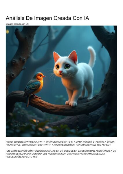 Mi prompt fue: A WHITE CAT WITH ORANGE HIGHLIGHTS IN A DARK FOREST STALKING A BIRDIN PIXAR-STYLE WITH A NIGHT LIGHT WITH A HIGH-RESOLUTION PANORAMIC VIEW 16:9 ASPECT