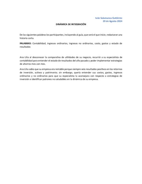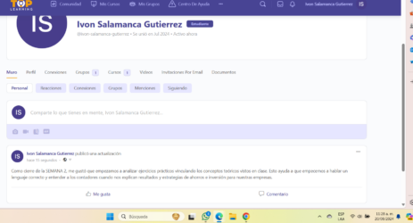 Como cierre de la SEMANA 2, me gustó que empezamos a analizar ejercicios prácticos vinculando los conceptos teóricos vistos en clase. Esto ayuda a que empecemos a hablar un lenguaje correcto y entender a los contadores cuando nos explican resultados y estrategias de ahorros e inversión para nuestras empresas.